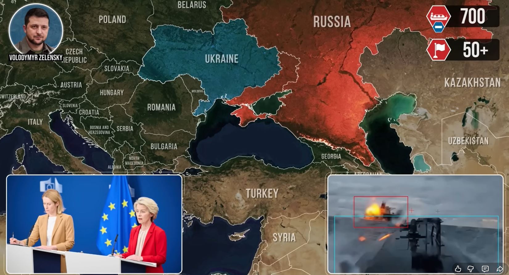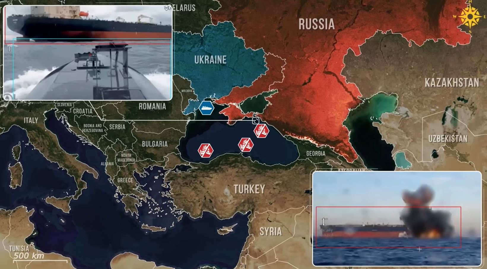 Screenshot from Reporting From Ukraine's video. Black Sea: The campaign beginsFirstly, Ukraine demonstrated in the Black Sea that these sanctions are not symbolic, escalating their maritime campaign by striking shadow fleet oil tankers with Sea Baby naval drones.