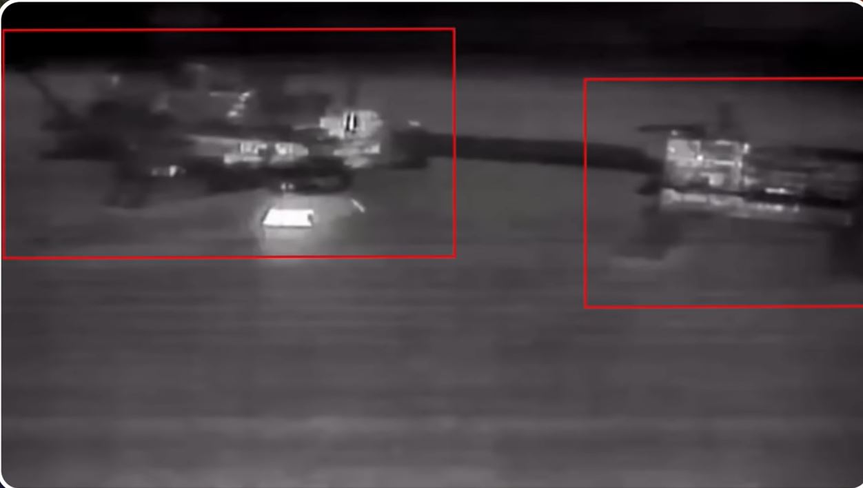 Screenshot from Reporting From Ukraine's video.Follow-up attacks hit the Korchagin platform twice and later the Rakushechnoye platform, forcing repeated shutdowns. In the same operational cycle, Ukrainian special forces struck the Russian navy patrol ship Okhotnik operating nearby, which was deployed to urgently protect the platforms, but was unable to protect even itself.
