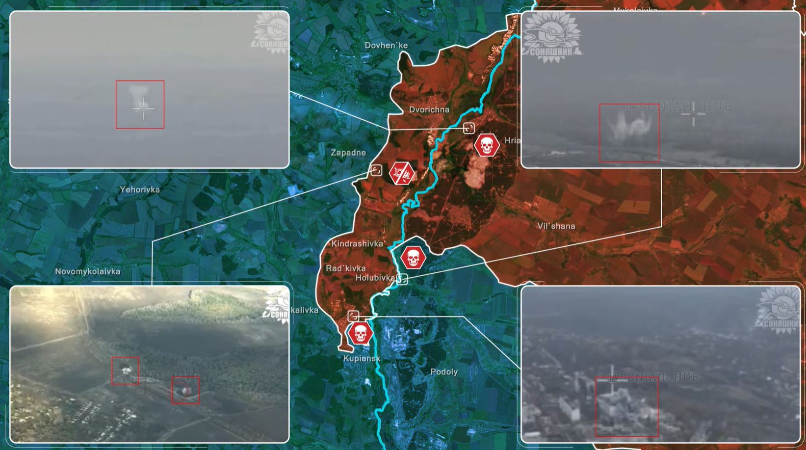 Screenshot from Reporting From Ukraine's video.Another concentration was destroyed near Holubivka when J-dam bombs from a Ukrainian F-16 annihilated a group mid-crossing. Ukrainian aircraft continued to hit ammunition depots, troop clusters, and drone-operator positions, steadily dismantling Russia’s ability to support its units already deployed in Kupiansk.